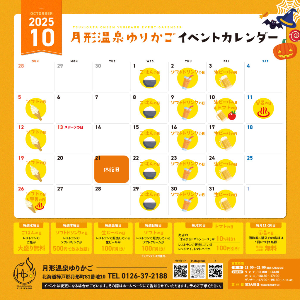 10月イベントカレンダーのご案内 2025年9月17日 10月開催イベントが決定いたしました。 来月から定期イベントに下記の2点が追加となります。 ・水曜日:ご飯大盛り無料・木曜日:500円でソフトドリンク飲み放題 皆様のご来館を心よりお待ちしております。