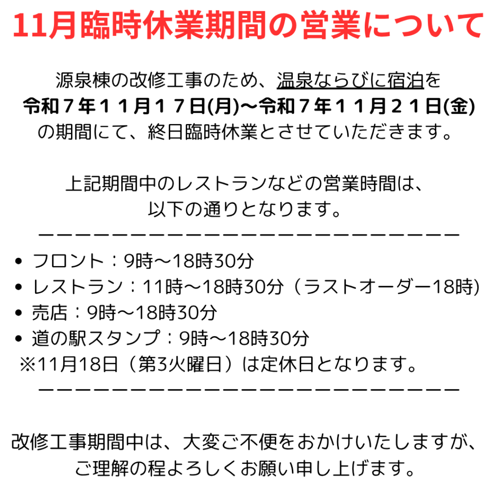 温泉ならびに宿泊を「令和7年11月17日(月)~令和7年11月21日(金)」の期間にて、