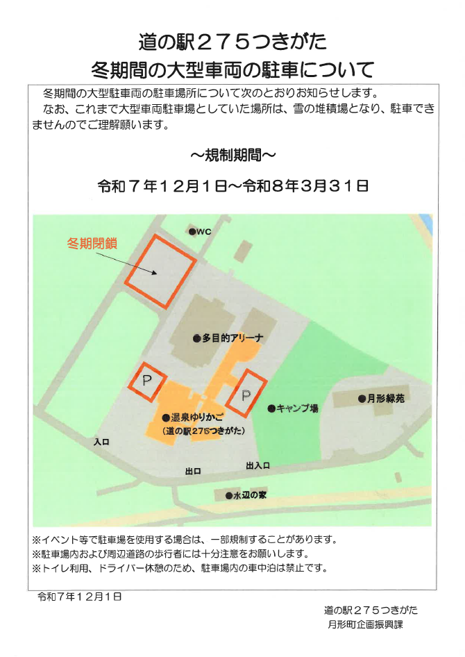 冬期間の大型車両の駐車規制について 2025年12月8日 冬期間の大型車両の駐車について規制いたします。 規制期間:令和7年12月1日~令和8年3月31日ご理解とご協力の程、何卒よろしくお願いいたします。